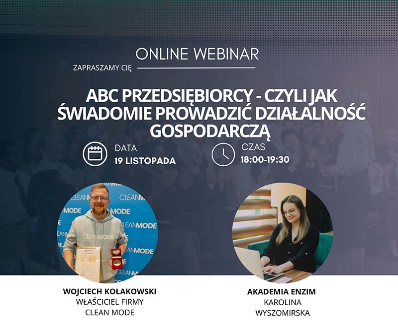 Zapraszamy Państwa na bezpłatny webinar ABC przedsiębiorcy – czyli jak świadomie prowadzić działalność gospodarczą przygotowany przez Akademię Enzim z udziałem Wojciecha Kołakowskiego.